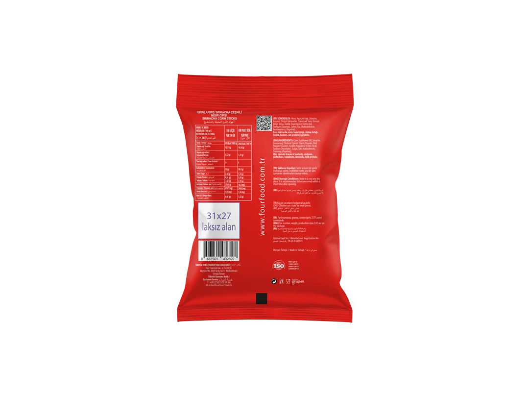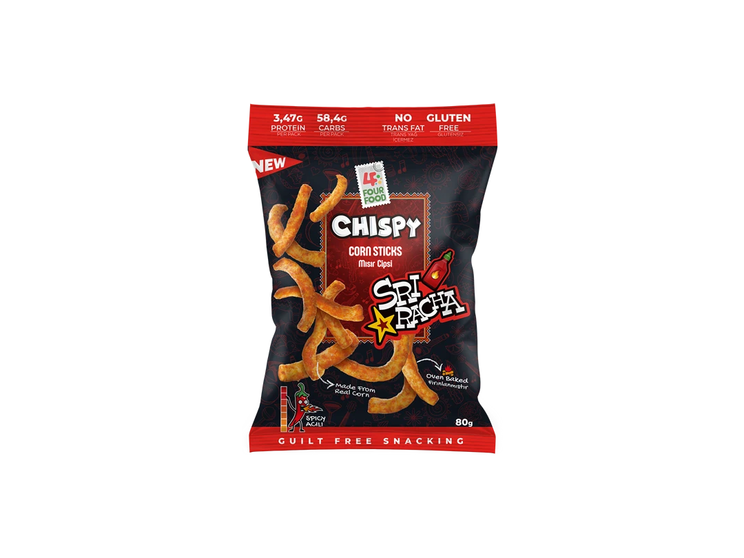 İÇİNDEKİLER: Mısır, Ayçiçek Yağı, Sriracha Çeşnisi: [Doğal Baharatlar: (Sarımsak Tozu, Kırmızı Biber Tozu), Asitlik Düzenleyici: (Sitrik Asit, Sodyum Diasetat) , Şeker, Tuz, Maltodekstrin, Renklendirici: (Paprika)]